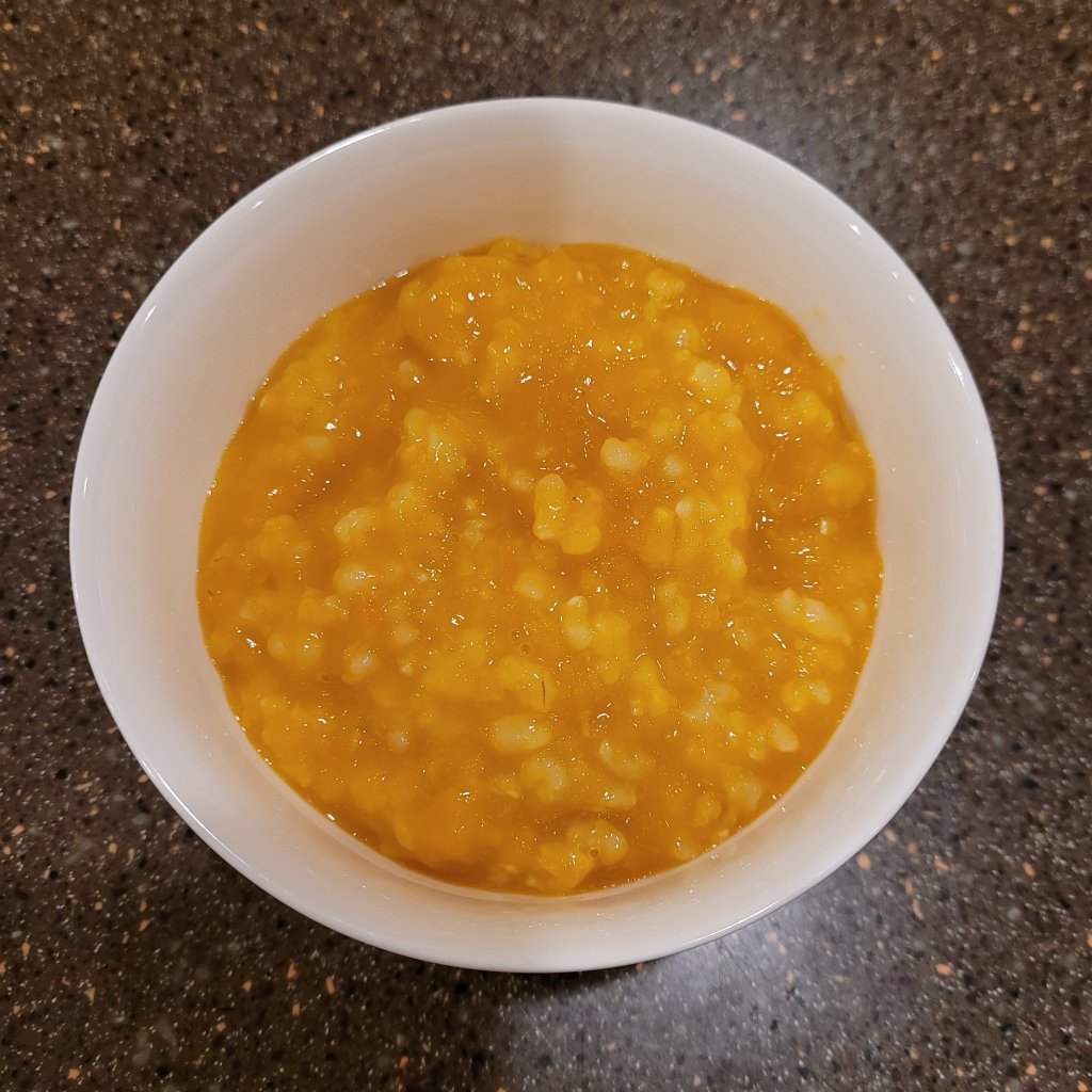 中国店买个切开的一磅的南瓜部分。洗一下,放烤箱400F烤一个小时左右,直到筷子能扎透。取出来,凉到不烫,去子,切块去皮。扔进高压锅,放些糙米喝水,按煮粥模式。完了以后,等自然高压解除。南瓜块已经煮烂,用勺子搅拌,混在一起就可以。一般南瓜就挺甜的,可以再加syrup调甜味。